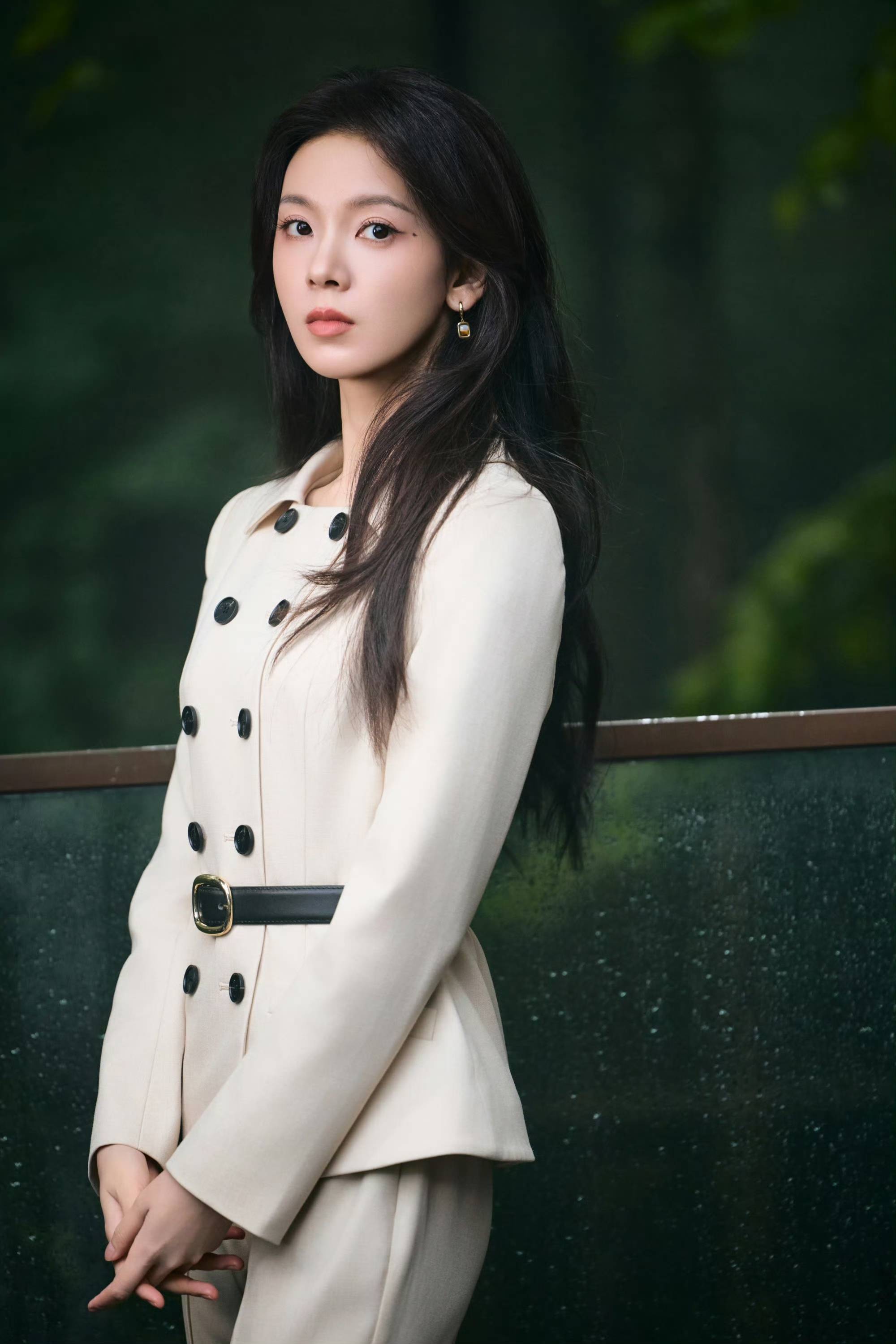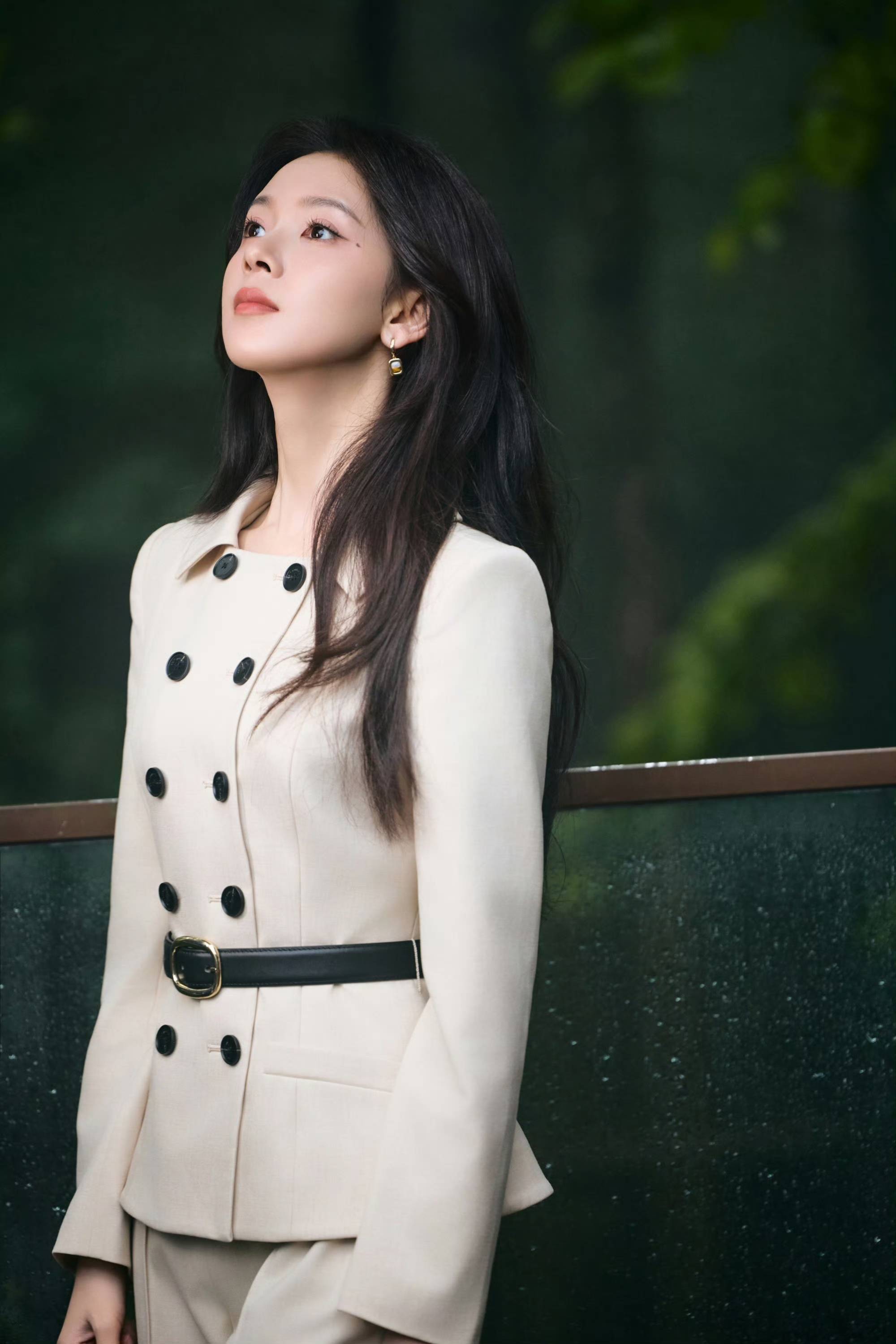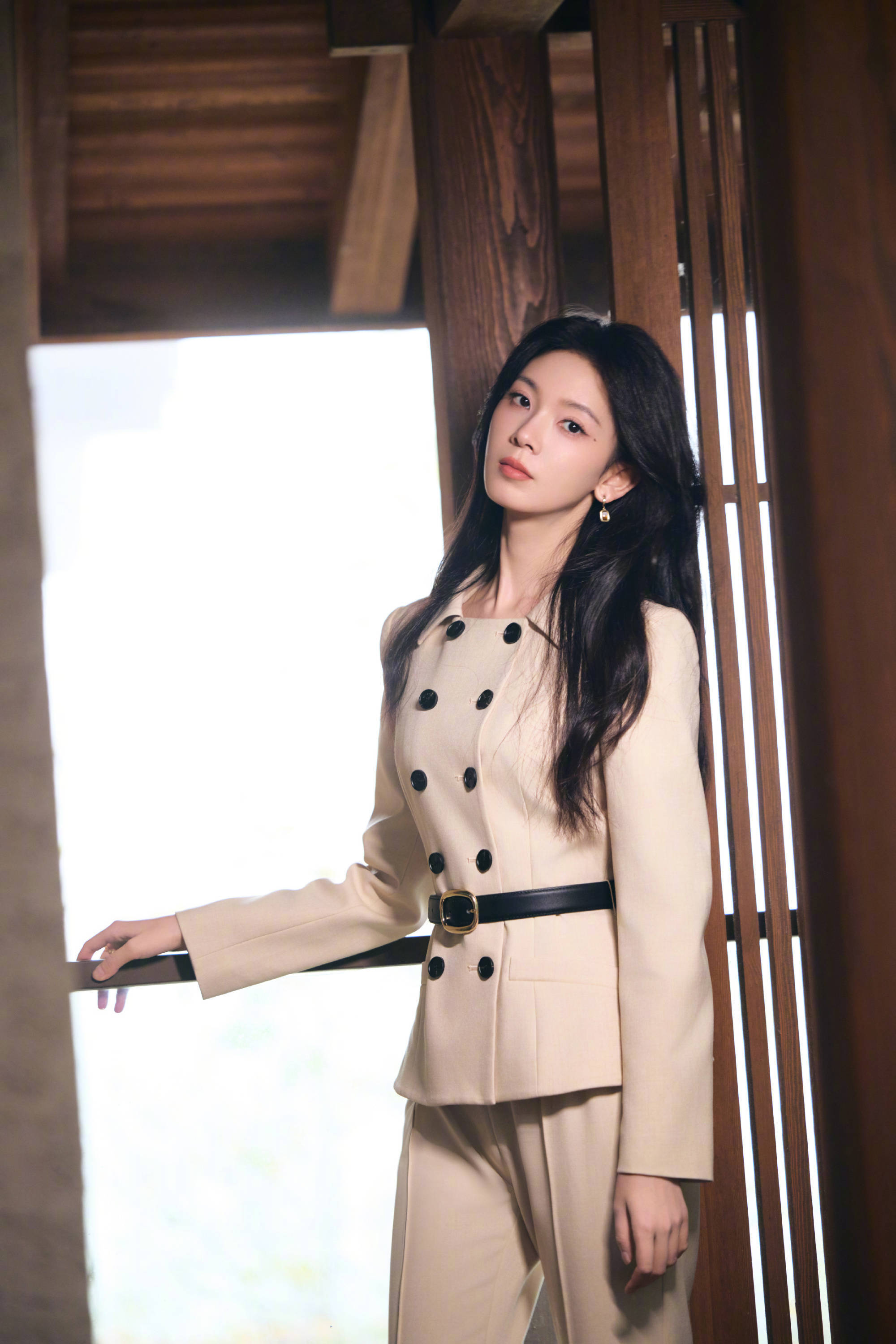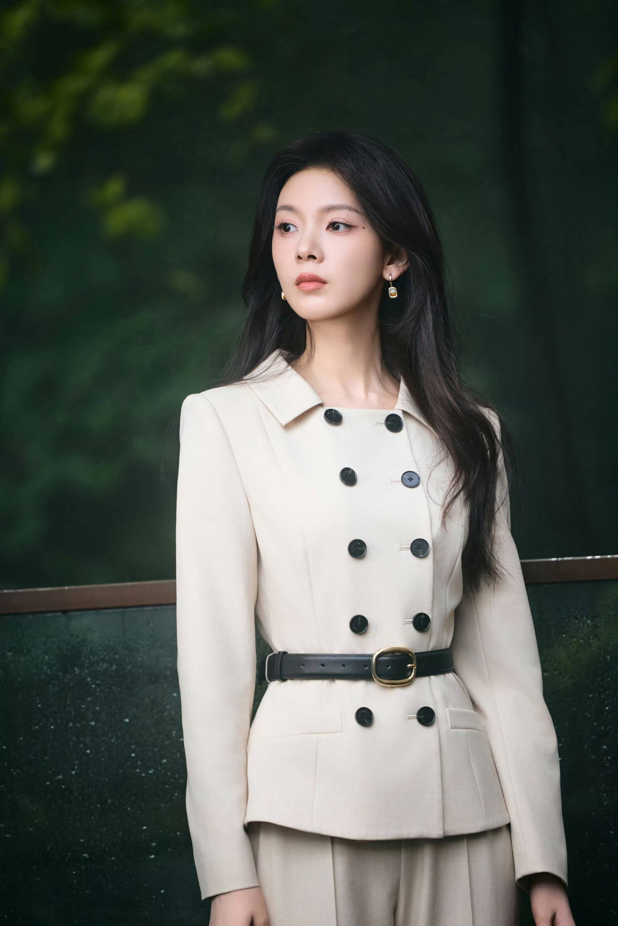陈瑶浅驼西装风格二重奏,于自然与建筑间演绎干练温柔